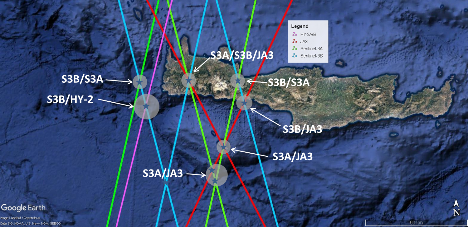 Multi-mission crossover analysis constitutes an alternative approach to estimate the relative bias between two (or more) satellite altimeters. This analysis involves the examination of the sea-surface heights, as estimated by each satellite altimeter when they happen to fly over the same location at sea within a short period of time (i.e., 1-3 days) (Fig. 1). Note that CryoSat-2 ground-tracks are not presented in Fig. 1, because of its drifting orbits.