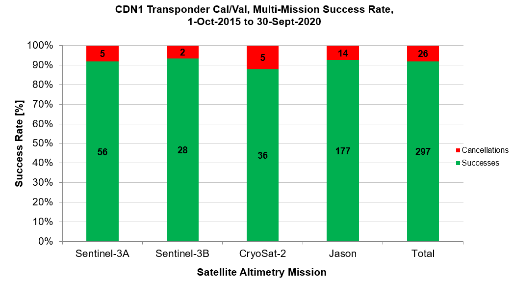 Till 30-Sept-2020, 323 transponder calibrations had been taken place for Sentinel-3A Pass No.14 (61 calibrations), Sentinel-3B (30 calibrations), CryoSat-2 (41 calibrations) and Jason Pass No.18 (191 calibrations). From these calibrations, 297 were successful whereas 26 had been cancelled mainly because of extreme weather conditions to protect the transponder.